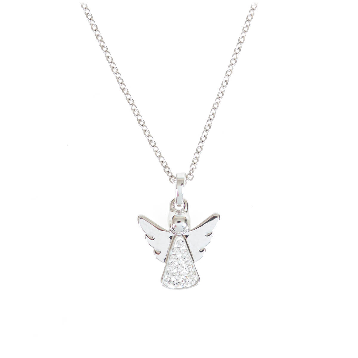 Feines Schmuckstück: Halskette mit Anhänger Engel, glänzende Rhodium- Beschichtung, teilweise besetzt mit hochwertigen Kristallsteinen.
