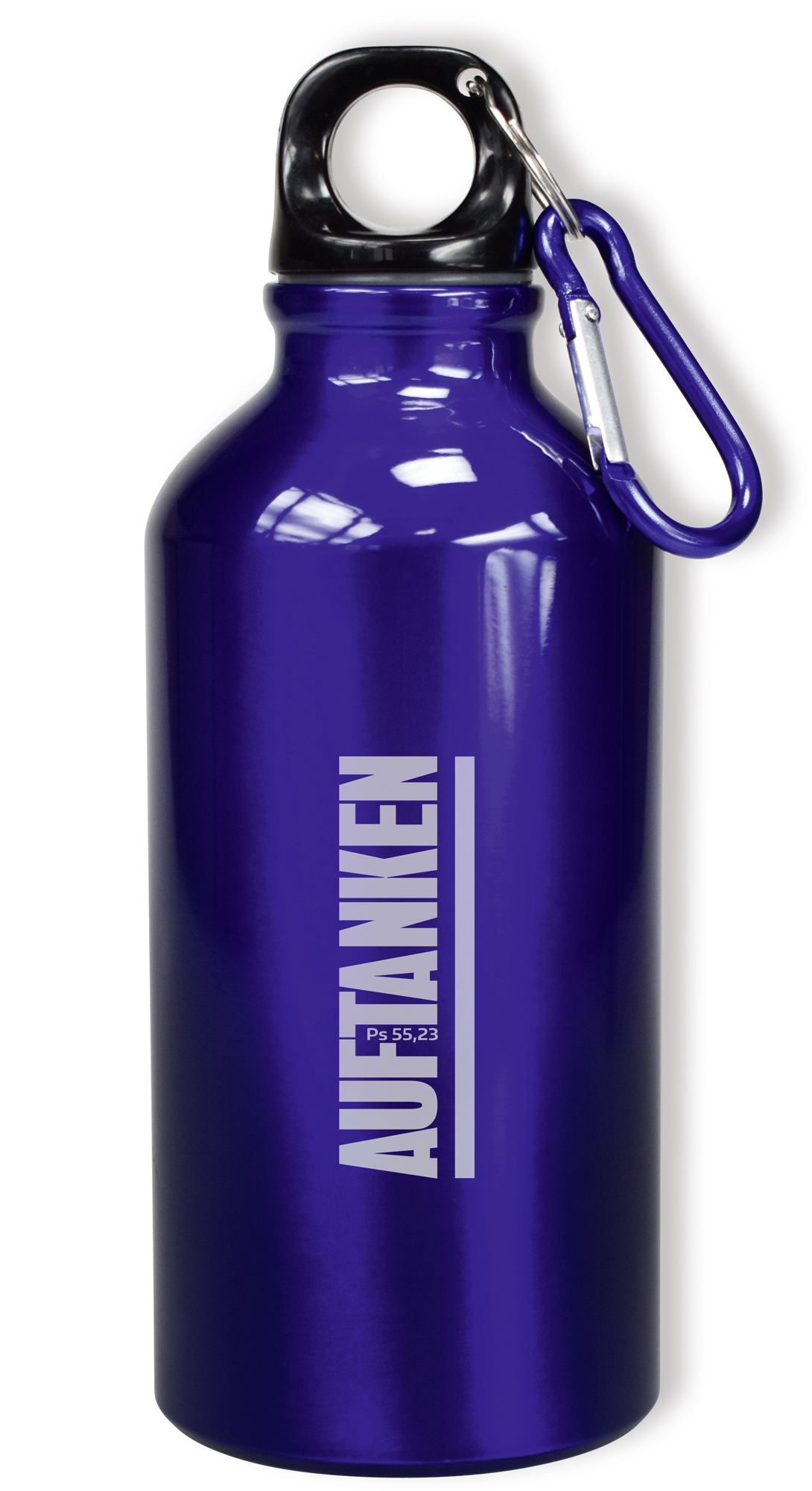 praktische Trinkflasche für unterwegs, bedruckt mit „Auftanken Ps 55,23“, Höhe 18,5 cm, 0,4 ltr., Kunststoff-Schraubverschluss mit Schlüsselring und farblich passendem Karabinerhaken, einzeln verpackt, Preis pro Stück