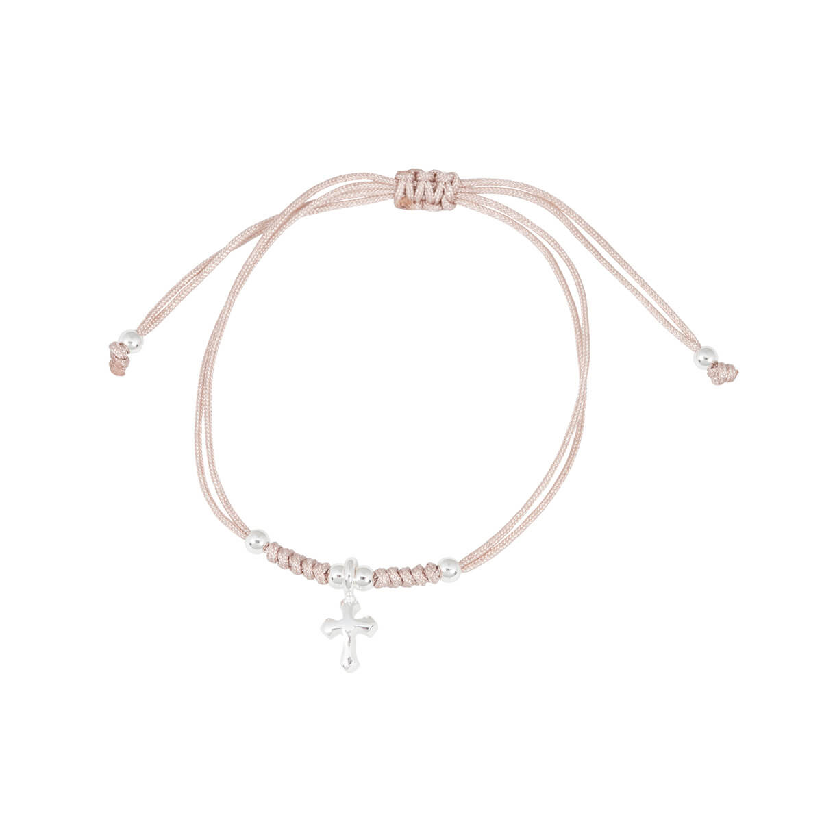 Feines, handgeknüpftes, farbiges Bändchen Armband mit kleinem Kreuz.