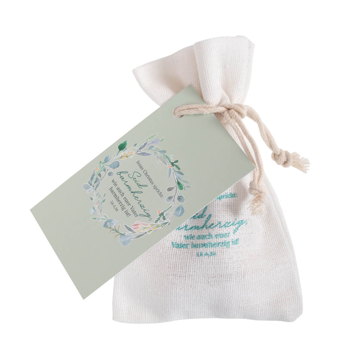 - Mit kleiner Karte im Baumwollsäckchen verpackt.