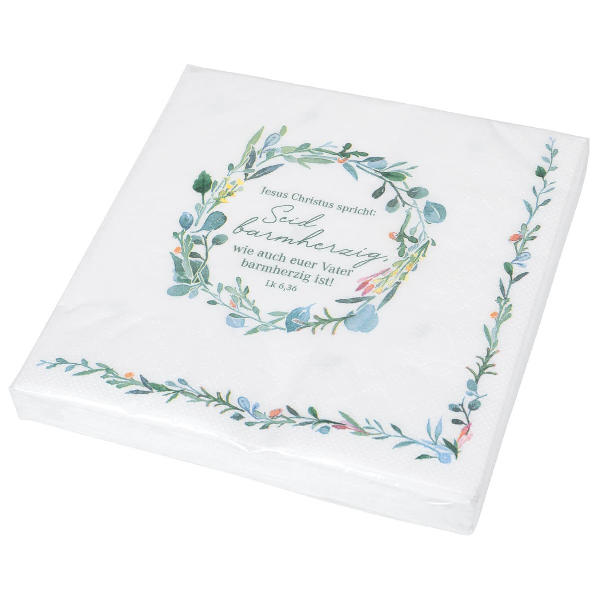 Servietten mit ansprechenden Blumen Design und mit Text der Jahreslosung 2021.