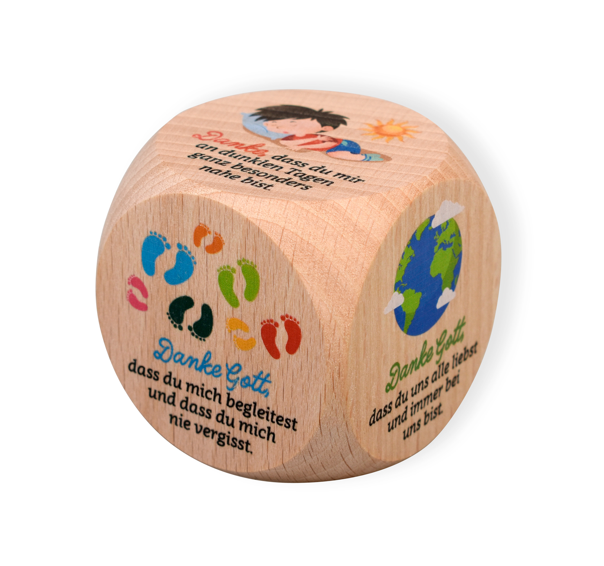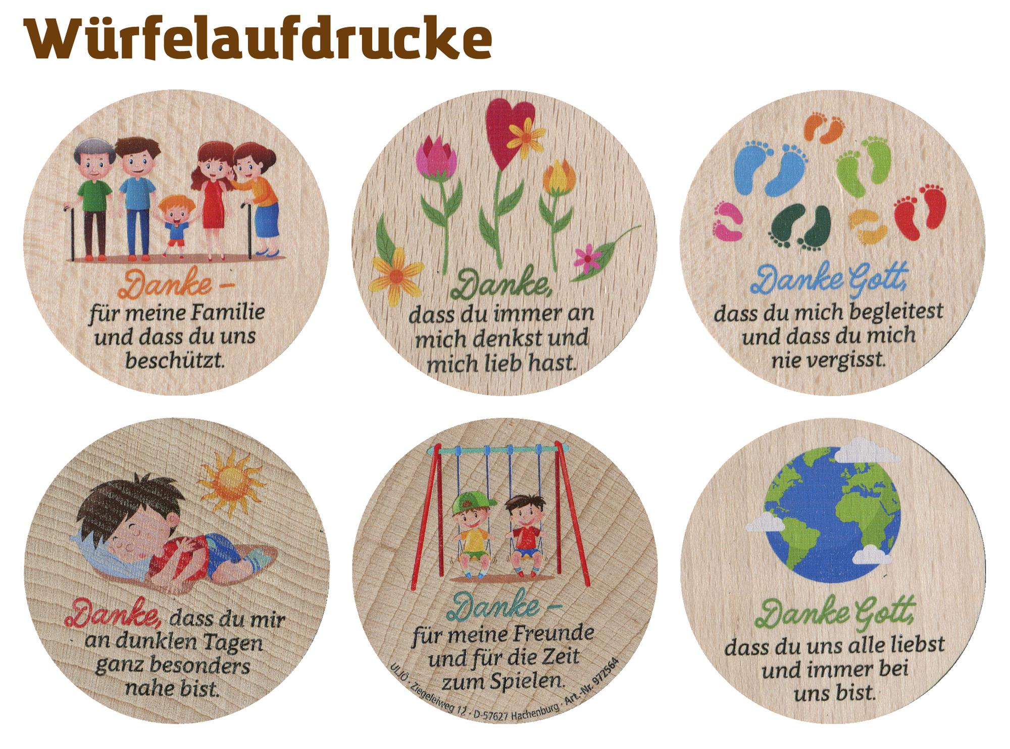 Jetzt auch in 6 cm Größe: Der beliebte Holzwürfel mit sechs Dankesgebeten, Buchenholz, mehrfarbig bedruckt