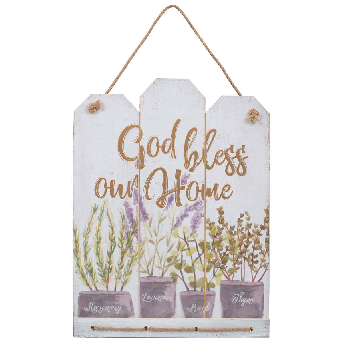 Bedruckt mit "God bless our Home" und Kräutertöpfen, mit Kordelapplikation.