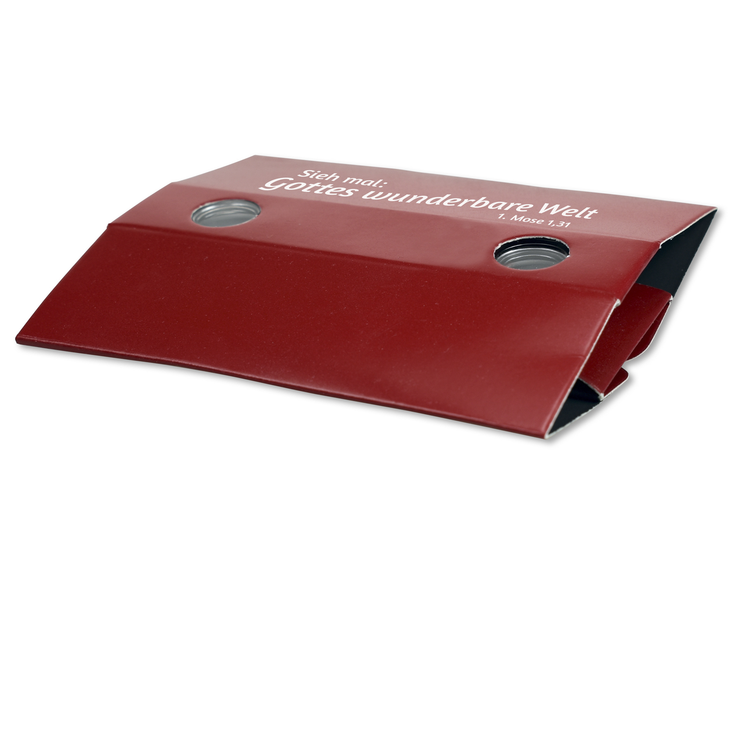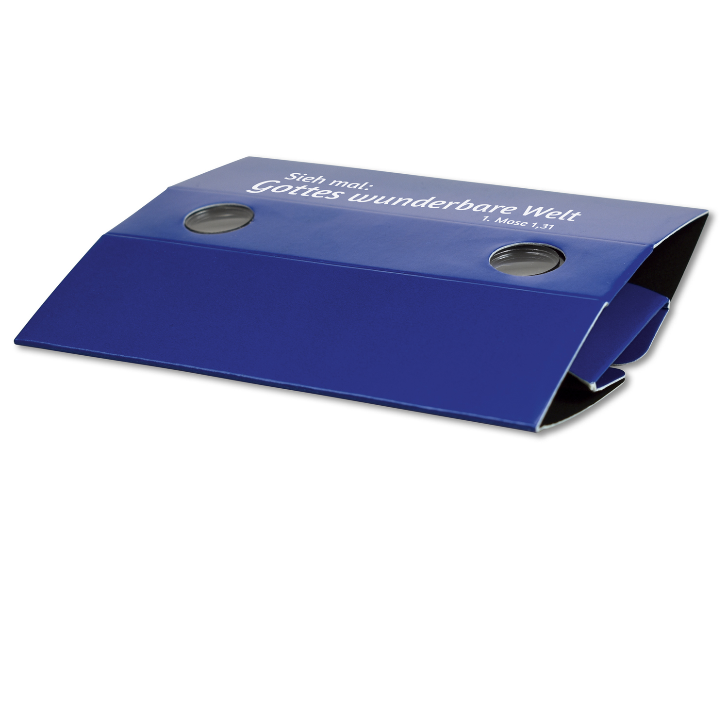 Das passt in jede Hosentasche: handliches Taschenfernglas mit 3-facher Vergrößerung, auf- und zuklappbar, bedruckt mit stimmigem Vers „Sieh mal: Gottes wunderbare Welt 1. Mose 1,31“.