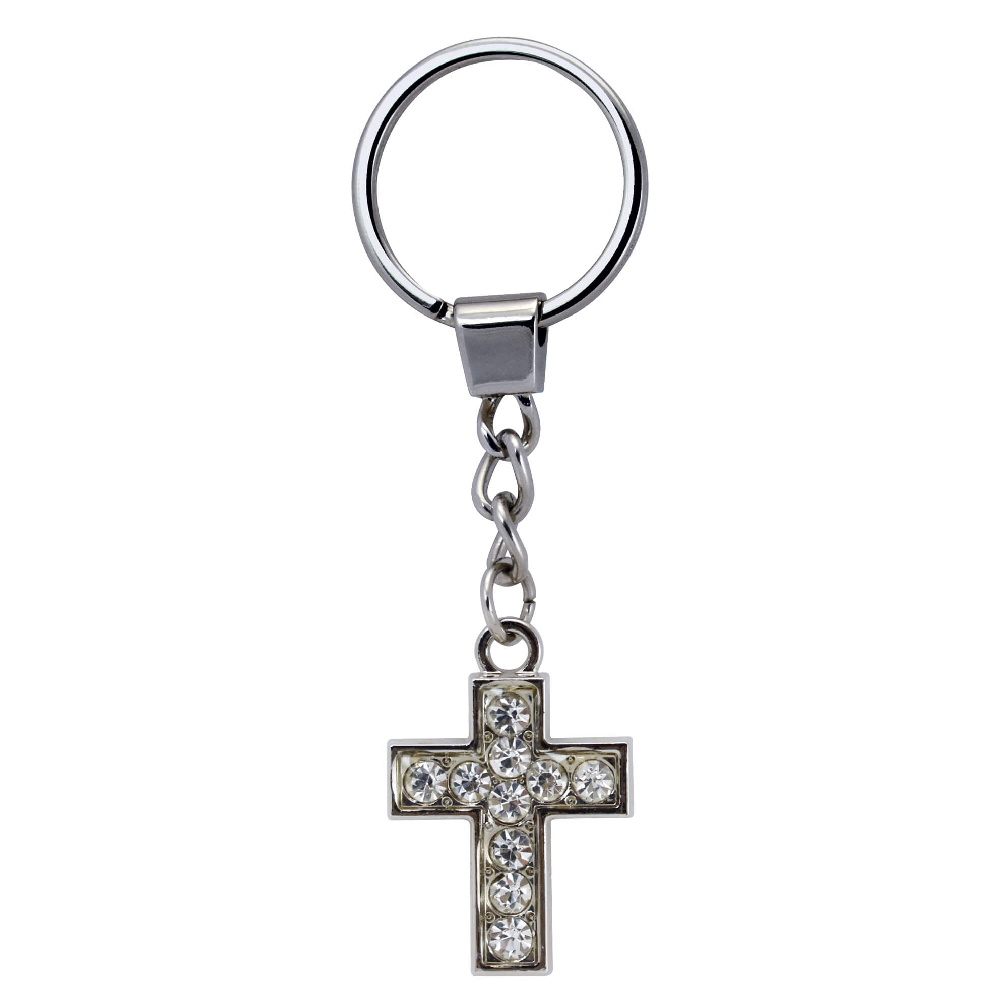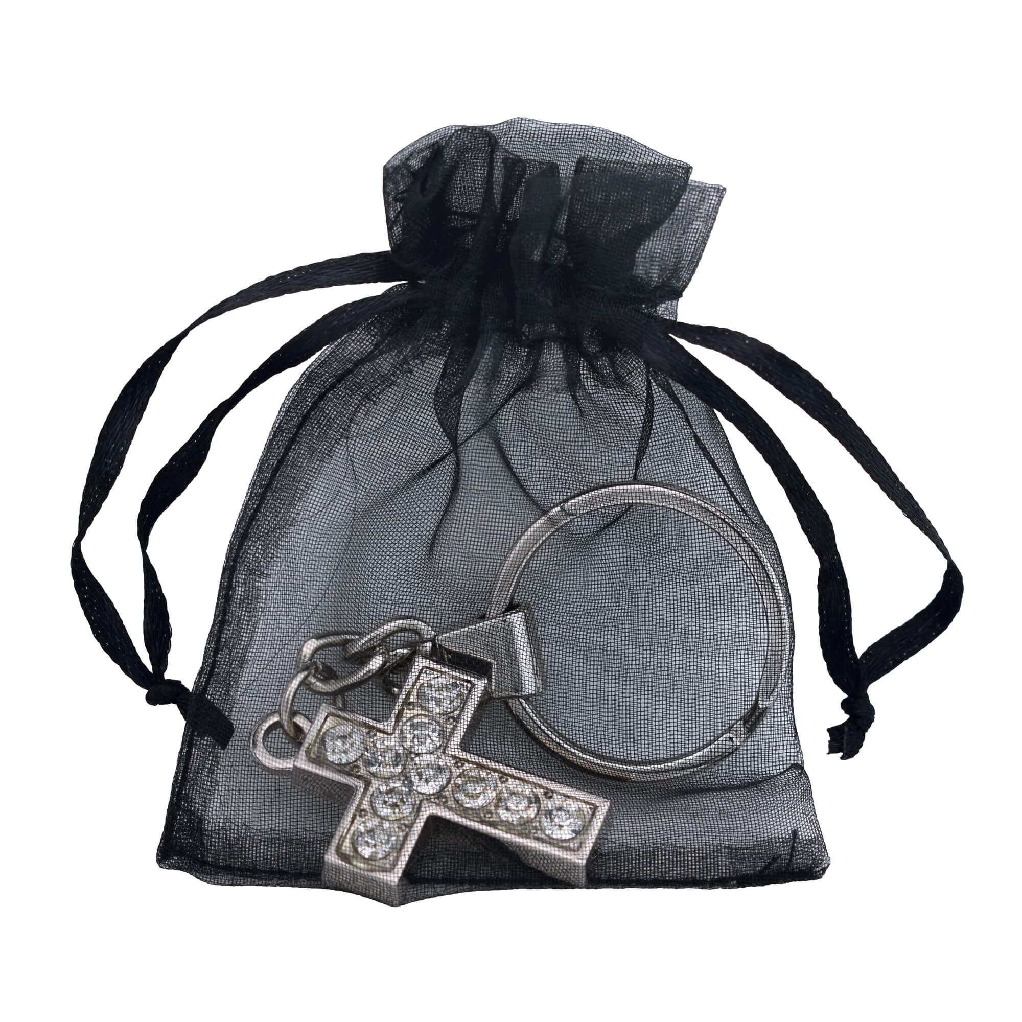 Edles Accessoire am Schlüsselbund und feines Geschenk für viele Gelegenheiten: Schlüsselanhänger Kreuz aus Metall, besetzt mit zehn funkelnden Strasssteinen, hübsch in schwarzem Organzabeutel verpackt. Gesamtlänge ca. 10 cm, Kreuz 2,5x3 cm
