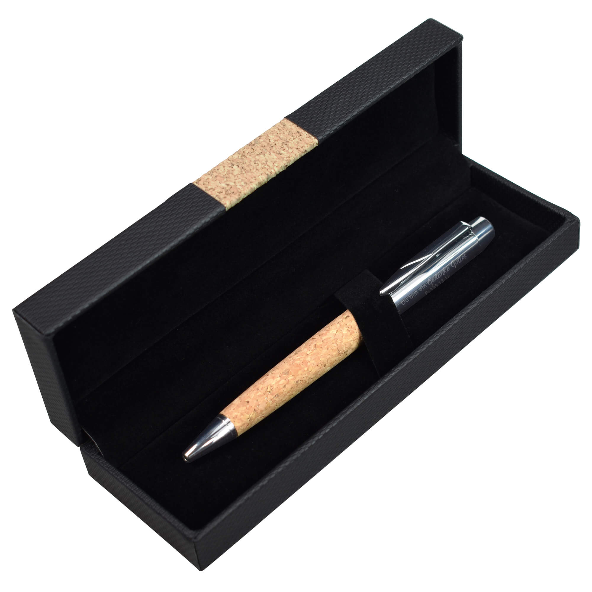 Metall-Kugelschreiber mit polierter Chrom-Oberfläche und Gravur „Du bist ein Gedanke Gottes Ps. 139, 13-16“, Schaft aus Kork, Minenfarbe: blau. Der Kuli hat ein Dreh-Klick-System. Hochwertig als Geschenk verpackt im Präsentetui mit Kork-Akzent.