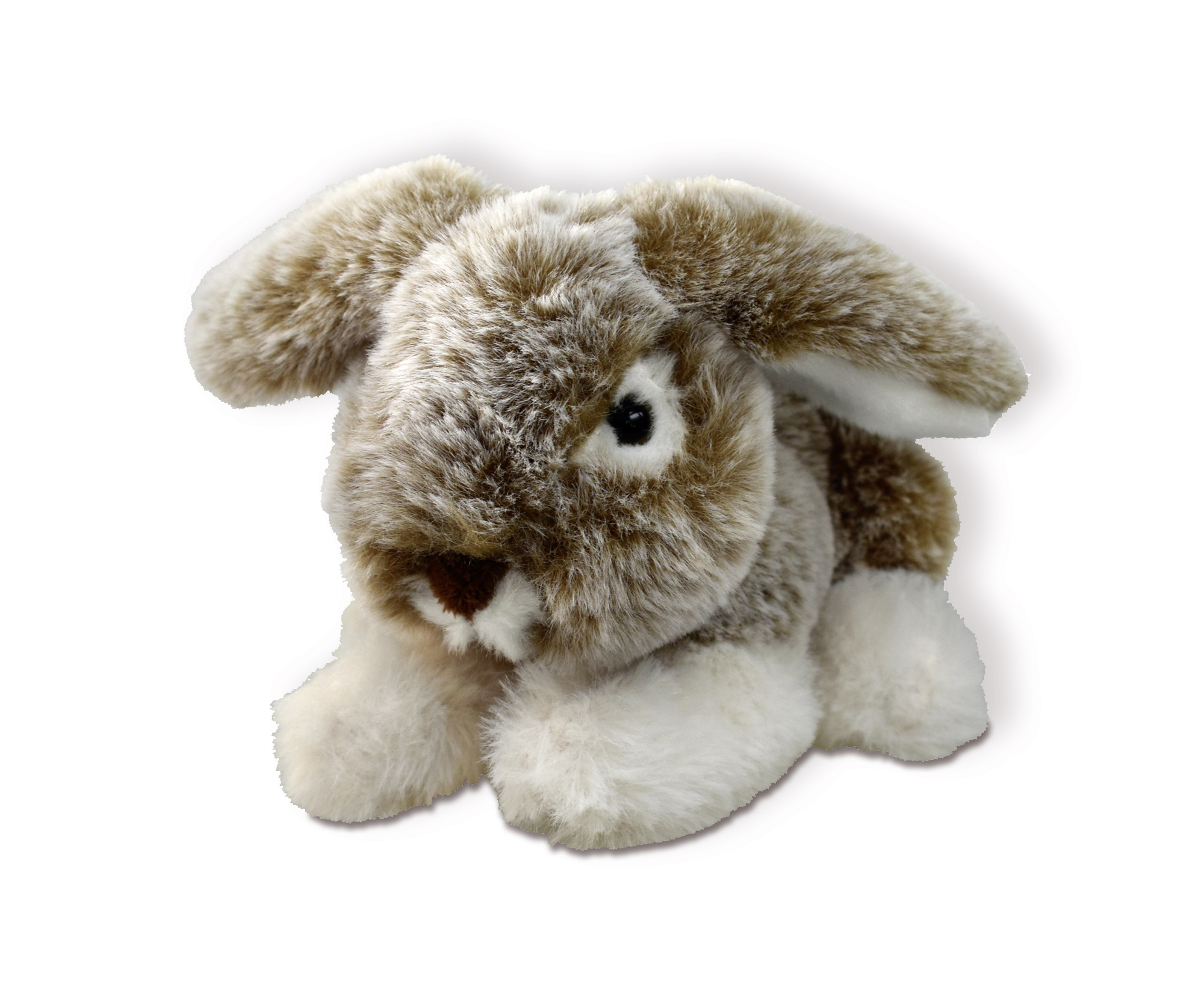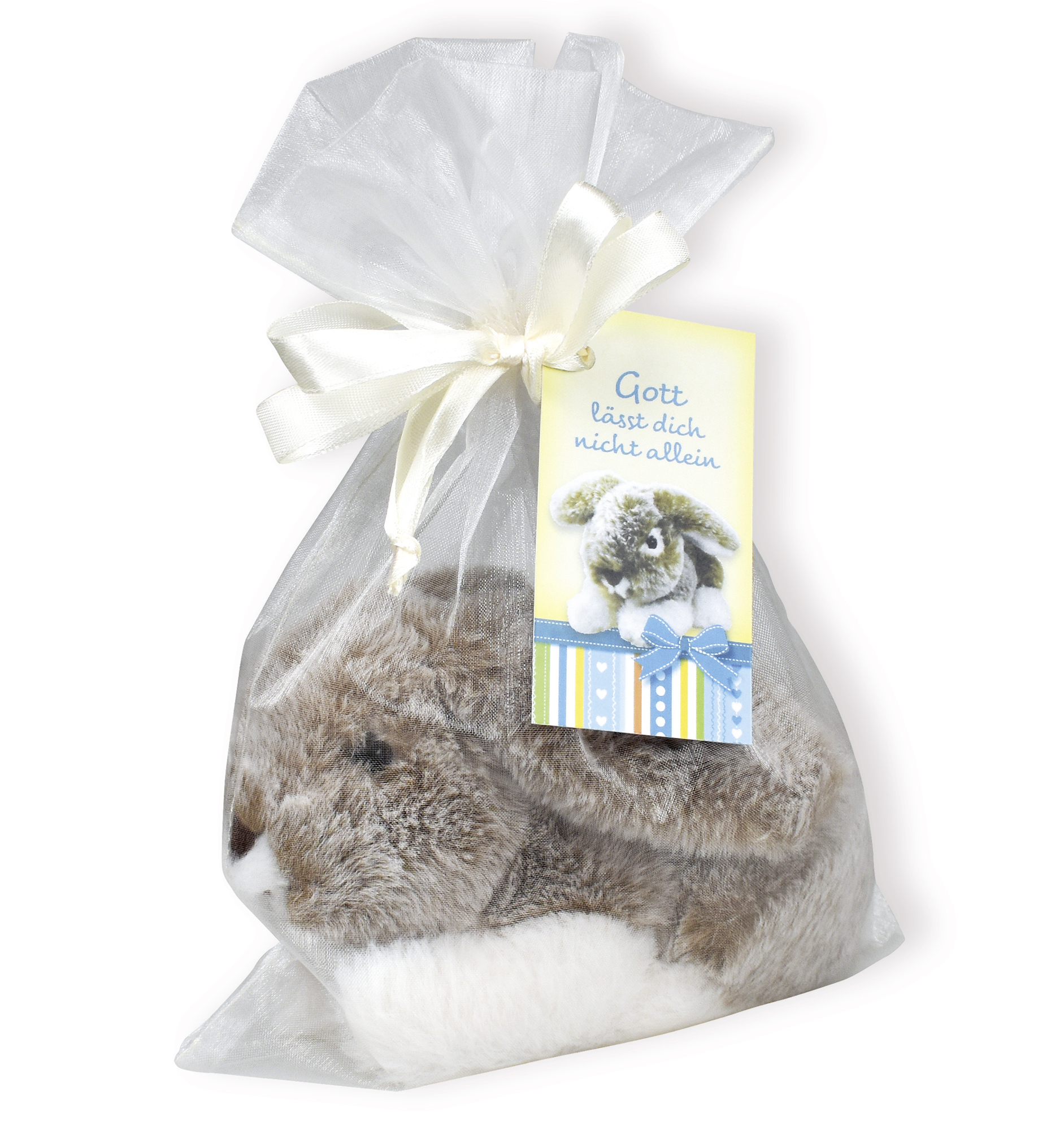 Hase aus kuscheligem Plüsch, 100% Polyester, ca. 15 cm, handwaschbar bis 30°C, im Organzabeutel mit Etikett "Gott lässt dich nicht alleine", zertifiziert nach EN71