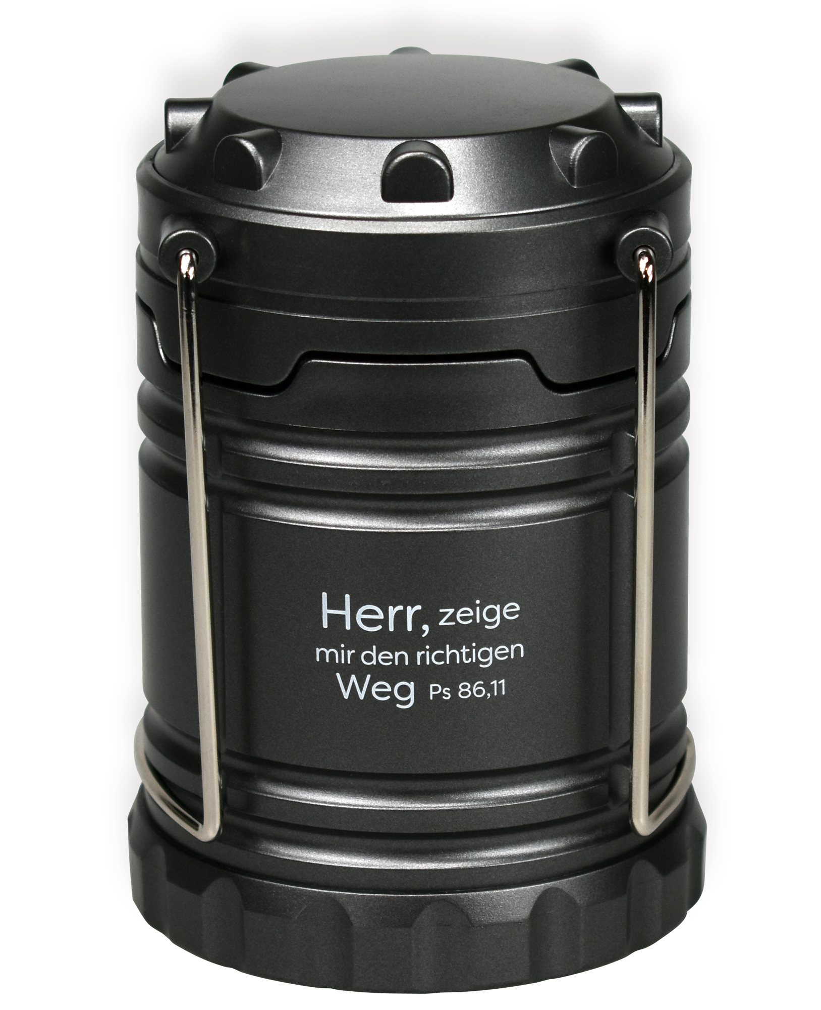Laterne aus robustem Kunststoff in der Farbe Anthrazit, Ø 8,5 cm, Höhe 12 cm, Metall-Aufhänge- und Tragegriffe, mit 6 LEDs, die sich durch das Ausziehen des Oberteils einschalten. Lieferung ohne Batterien (benötigt werden 3 AA-Batterien).