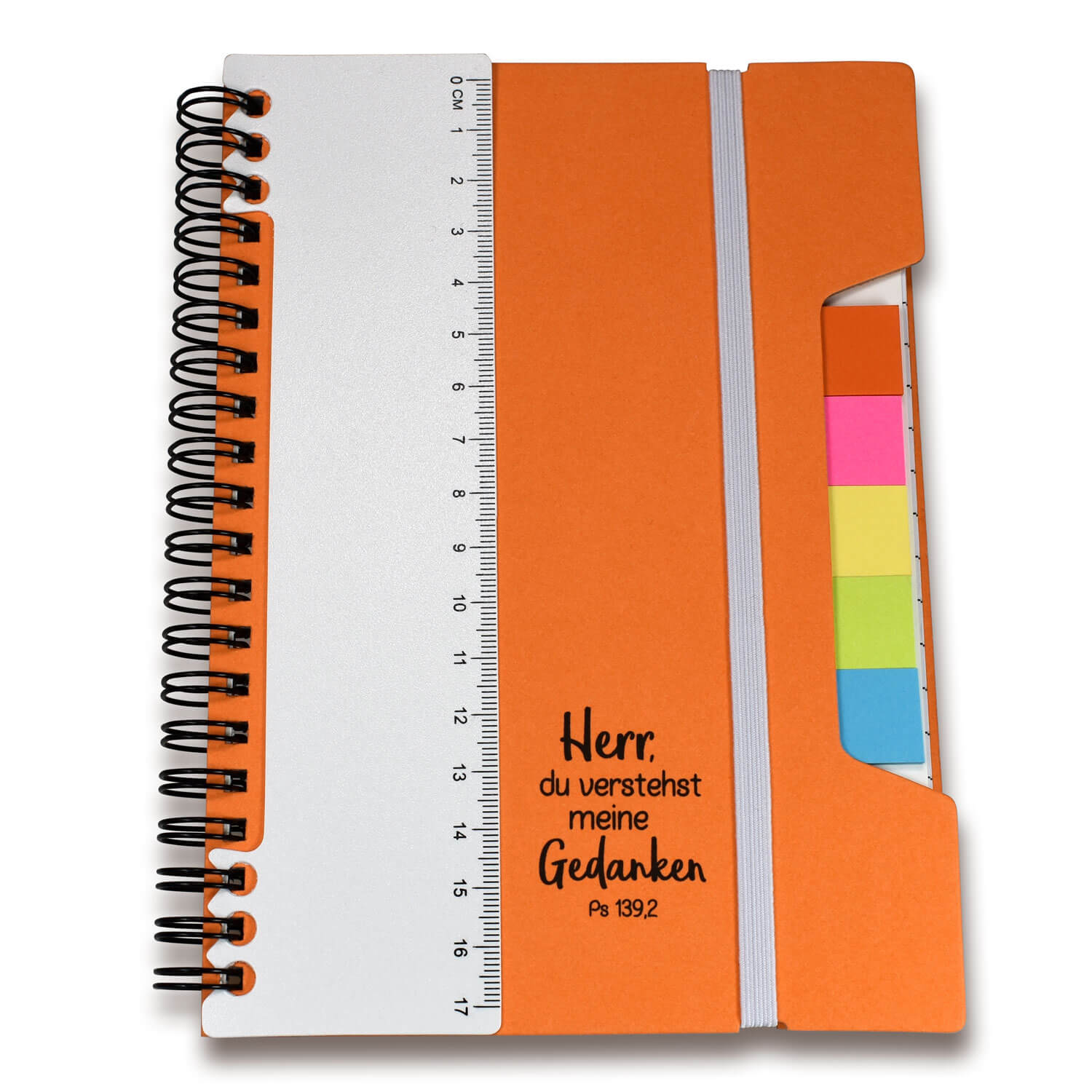 Kompaktes Notizbuch mit Ringbindung und elastischem Verschlussband, 13x18 cm, 60 linierte weiße Blätter und ein Adressblatt, abnehmbares Lineal (17 cm), Haftnotizstreifen (5 Farben, je 25 Stück), Aufdruck: "Herr, du verstehst meine Gedanken Ps 139,2"