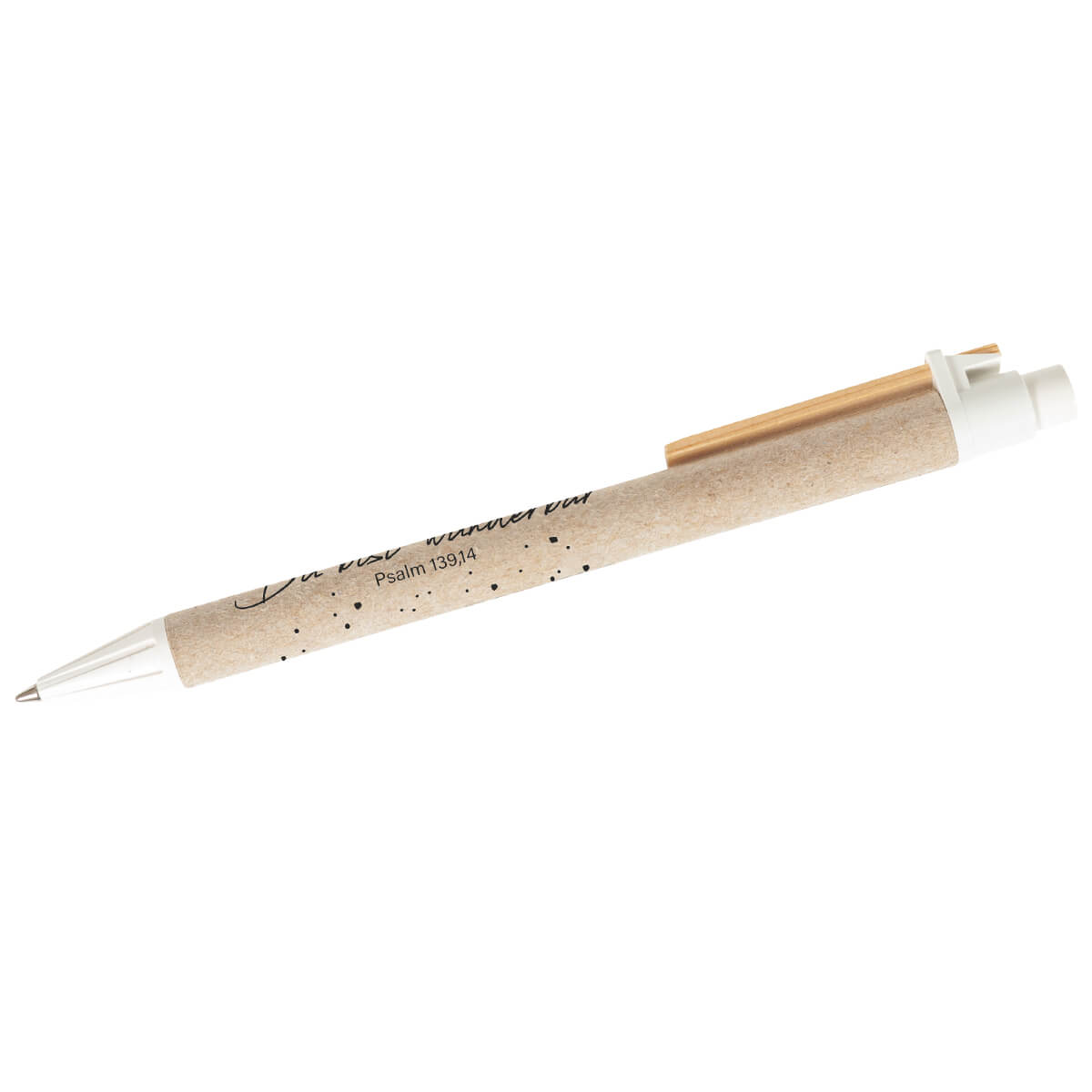 Überzeugender Material- Mix: Druckkugelschreiber mit Schaft aus recycelter Pappe, bedruckt mit Text: Du bist wunderbar.