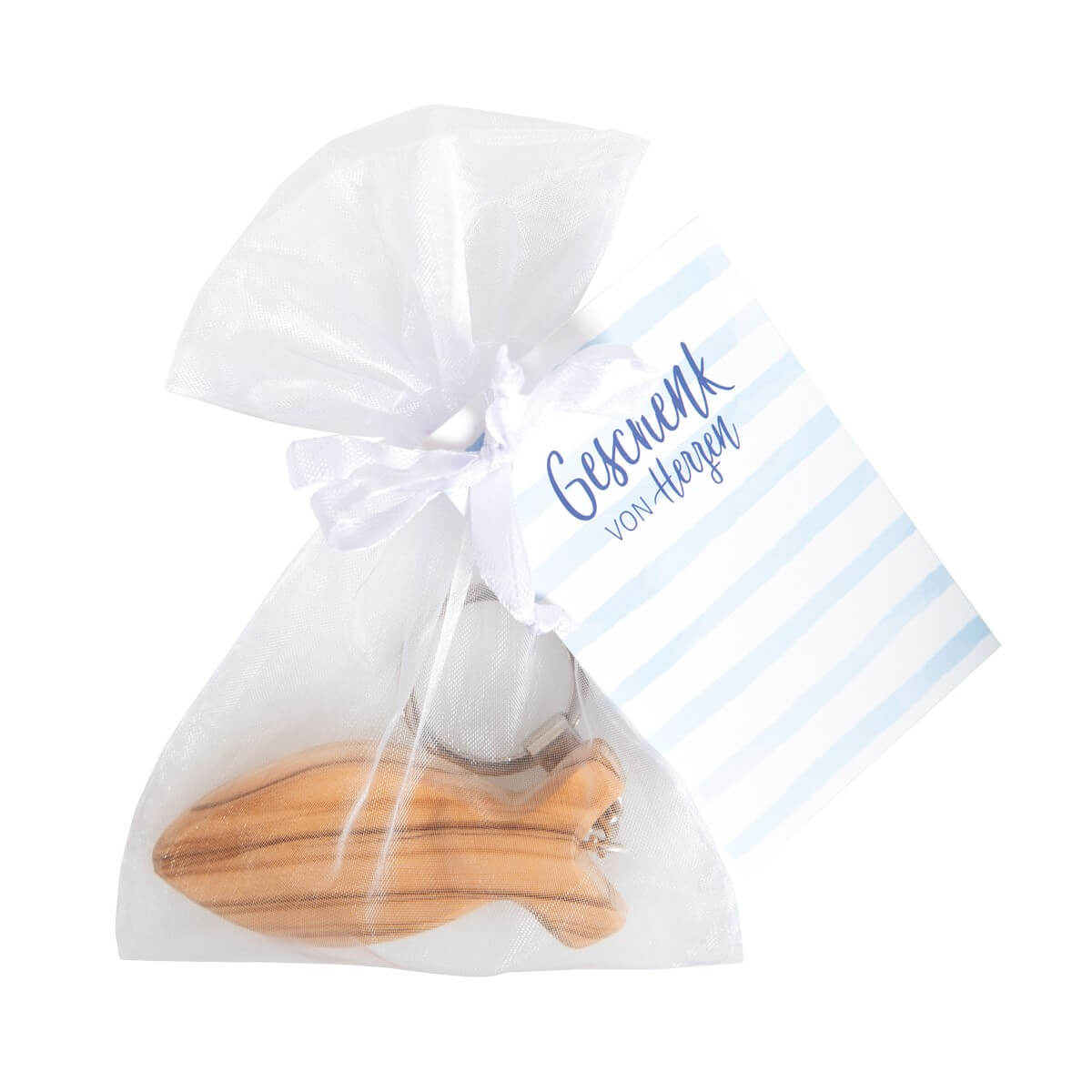 Liegt schön in der Hand, Schlüsselanhänger Fischsymbol aus Olivenholz.