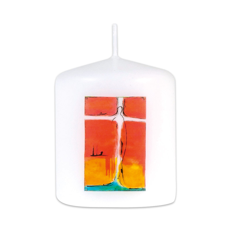 Kleine Kerze, mit modernen Kreuzdesign und orange-roten Farben.