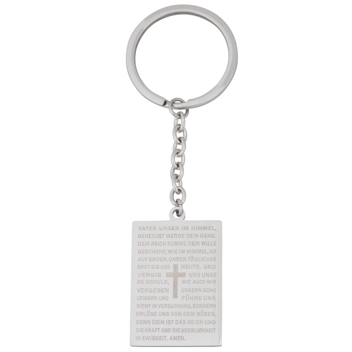 Exklusiver Schlüsselanhänger "Vater Unser" aus Edelstahl mit graviertem Text und Kreuz.
