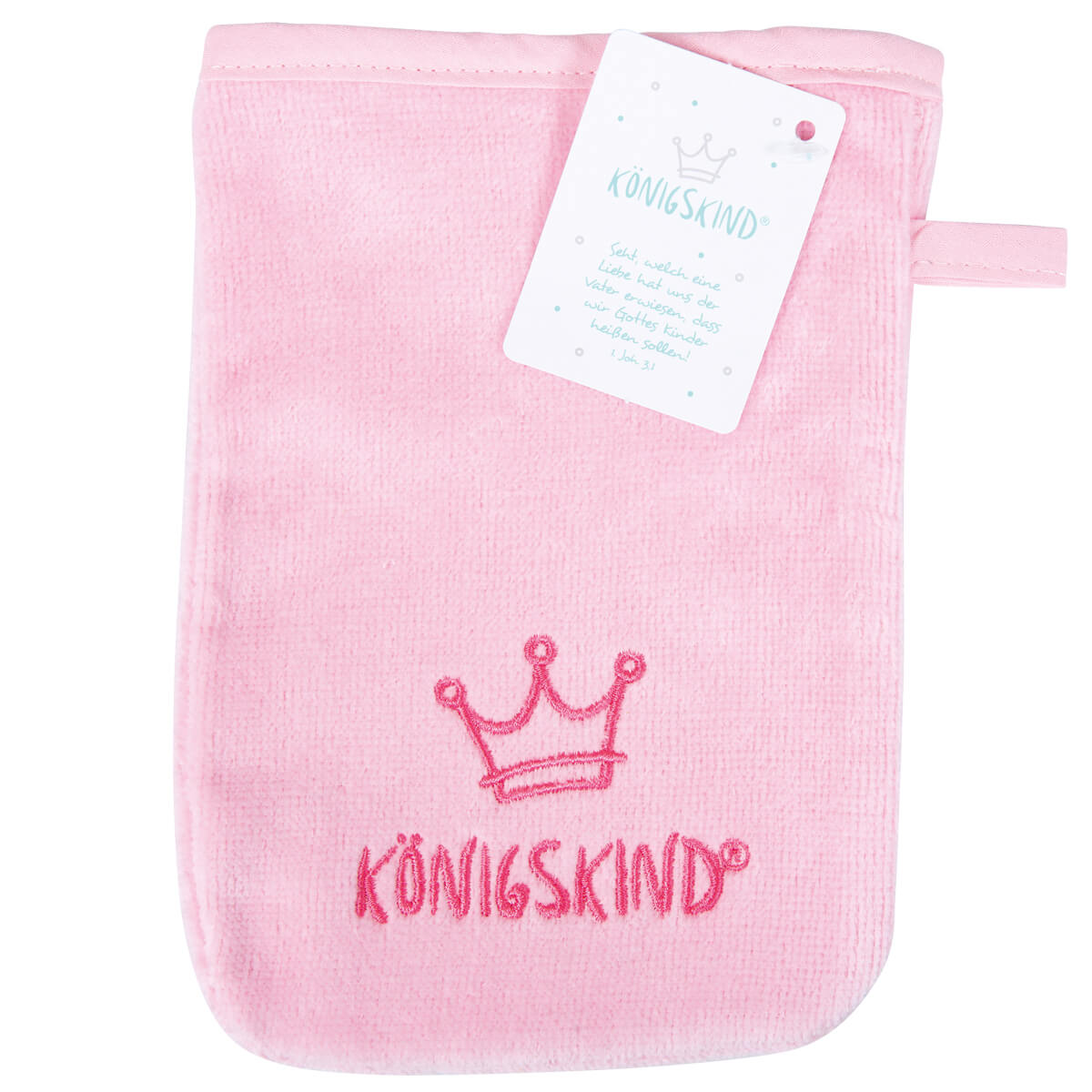 Liebevolles Geschenk zur Geburt oder Taufe: Waschhandschuh Königskind in schöner weicher Velours-Qualität.