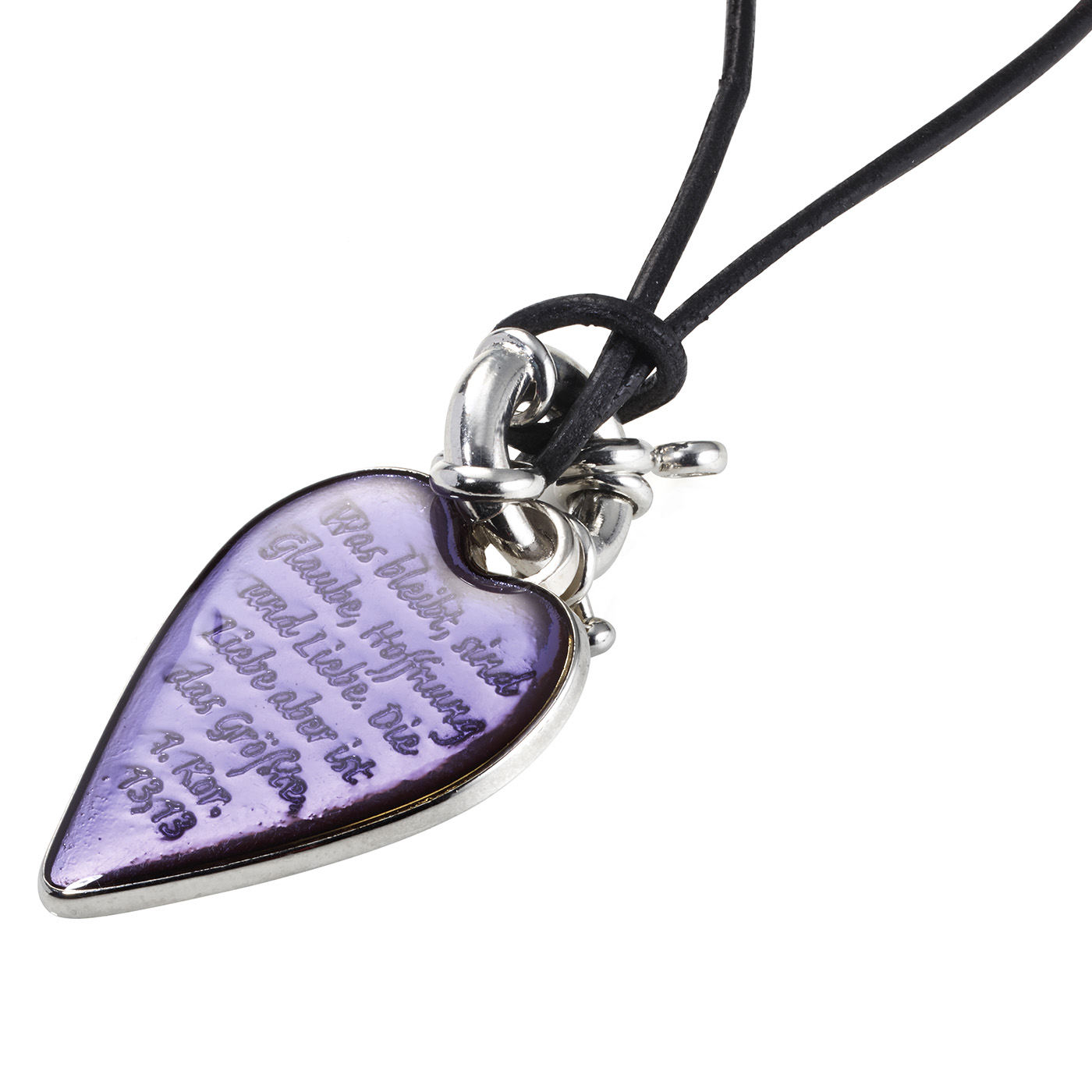 Modische Halskette mit Anhänger "Herz". Band aus Leder mit zweifarbigen Herz in Farbe silber/lila.