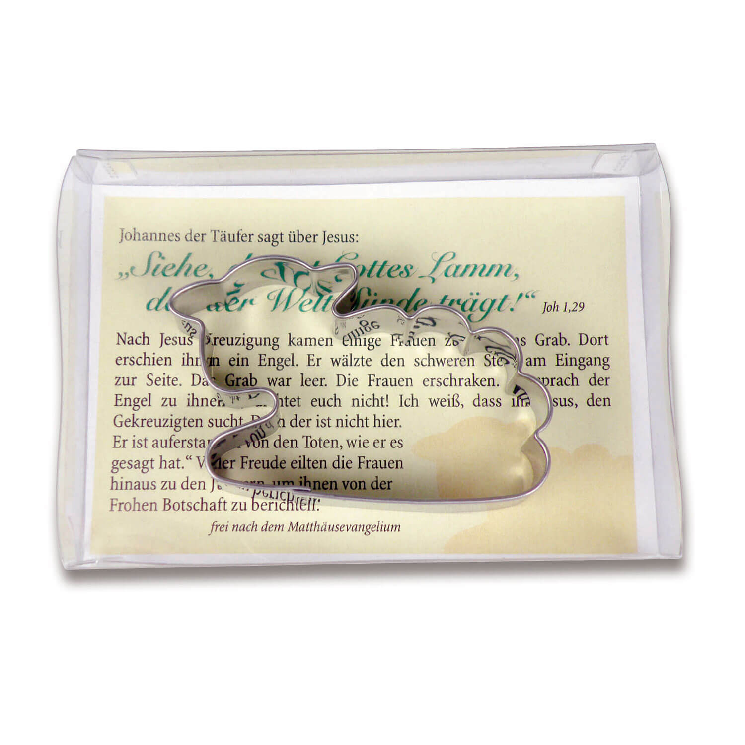 Ausstechform aus Weißblech in Klarsichtverpackung 10x7 cm, mit Einleger (Vorderseite Ostergeschichte, Rückseite Rezeptvorschlag für Plätzchen aus Quarkteig)