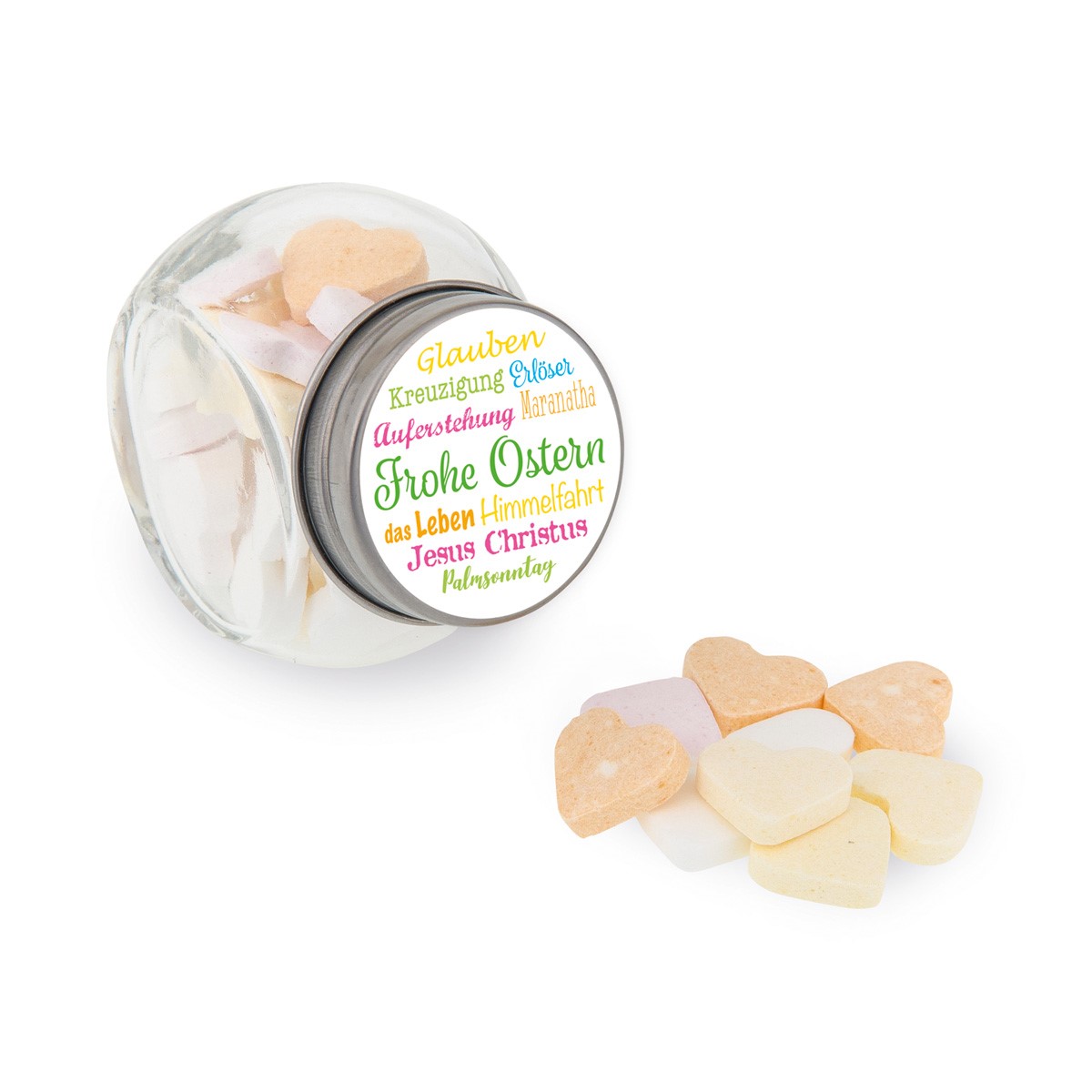 Schöne bunte Frühlingsfarben, Glas gefüllt mit 35 g Herzbonbons.