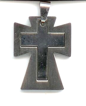 2-teiliger Kreuzanhänger, Edelstahl matt gebürstet, Format 2,5 x 3 cm, mit Lederband, verpackt im Samtsäckchen