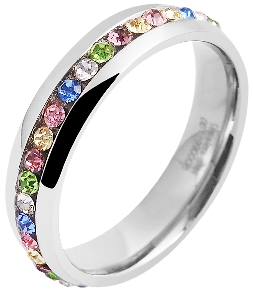 Modischer, eleganter Damenring aus Edelstahl, besetzt mit bunten Strasssteinen. Der Regenbogen erinnert an die Zusage Gottes dass nie wieder eine Sinnflut kommen wird. Oberfläche und Innenseite polliert.