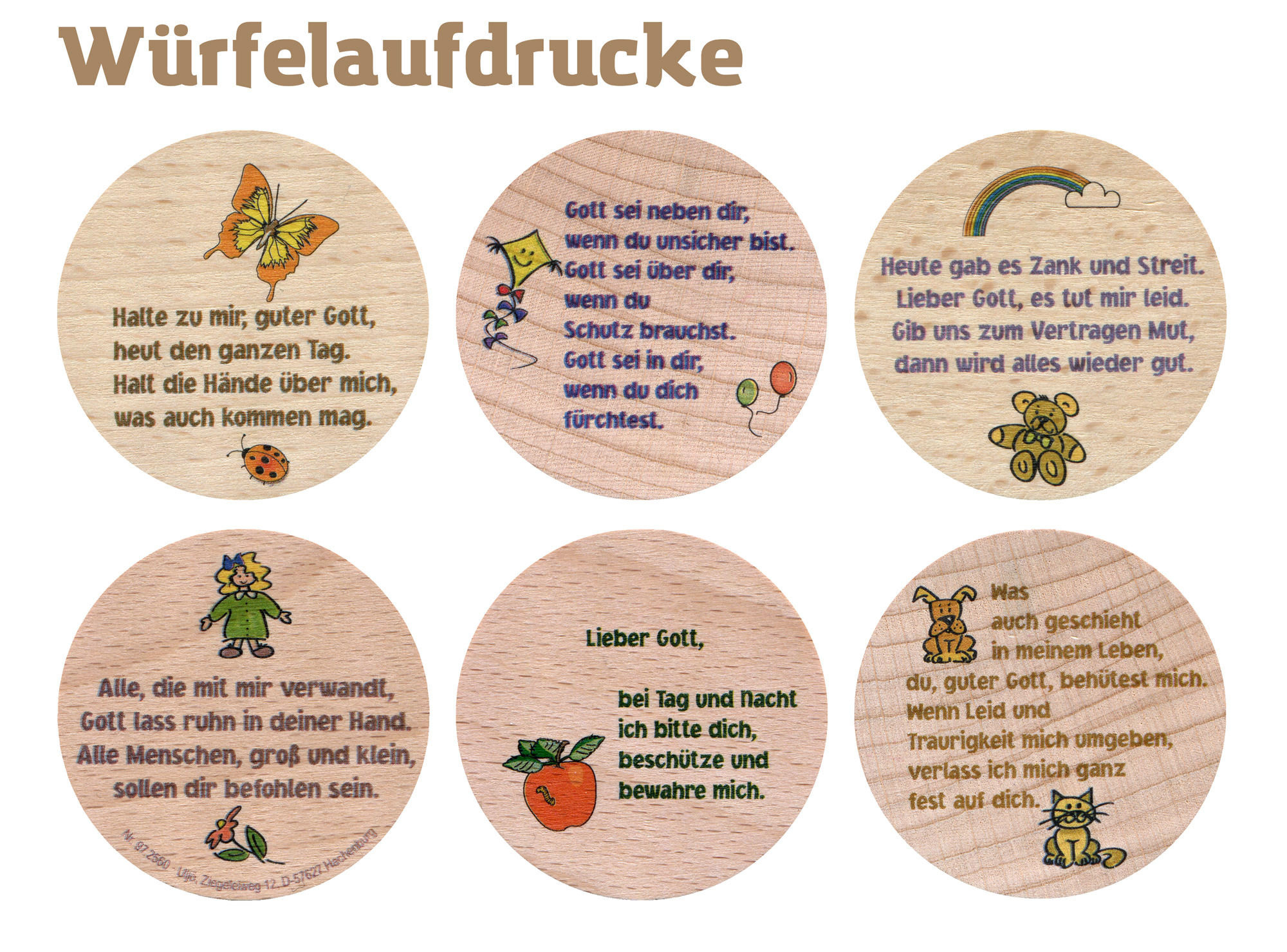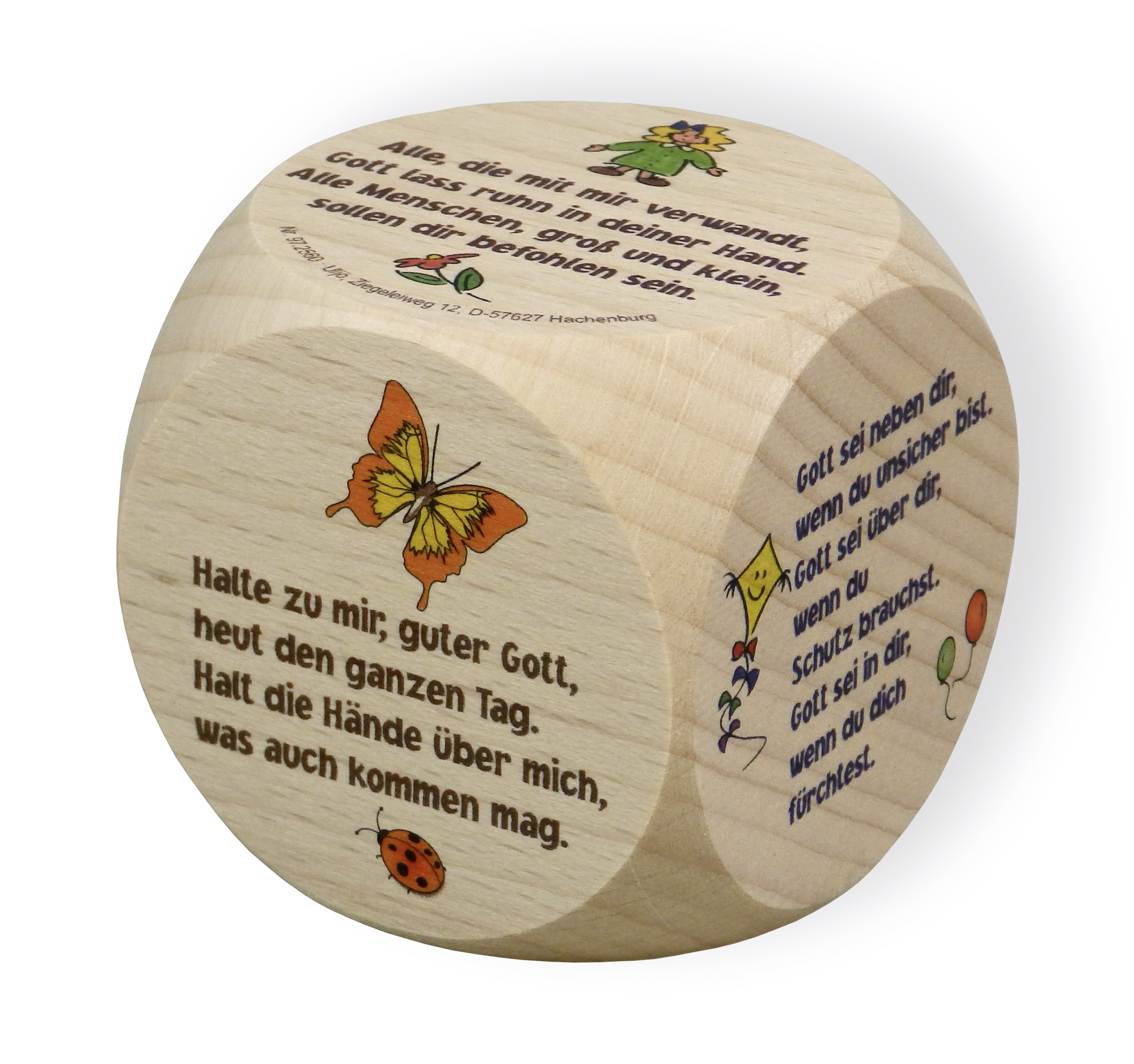 Farbig bedruckte Gebetswürfel aus Buchenholz, mit 6 verschiedenen Gebeten, Größe 5 cm