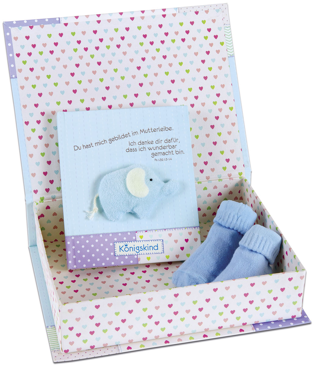 Baby Söckchen und Fotoalbum, in blauer Schmuckschachtel mit Applikationen