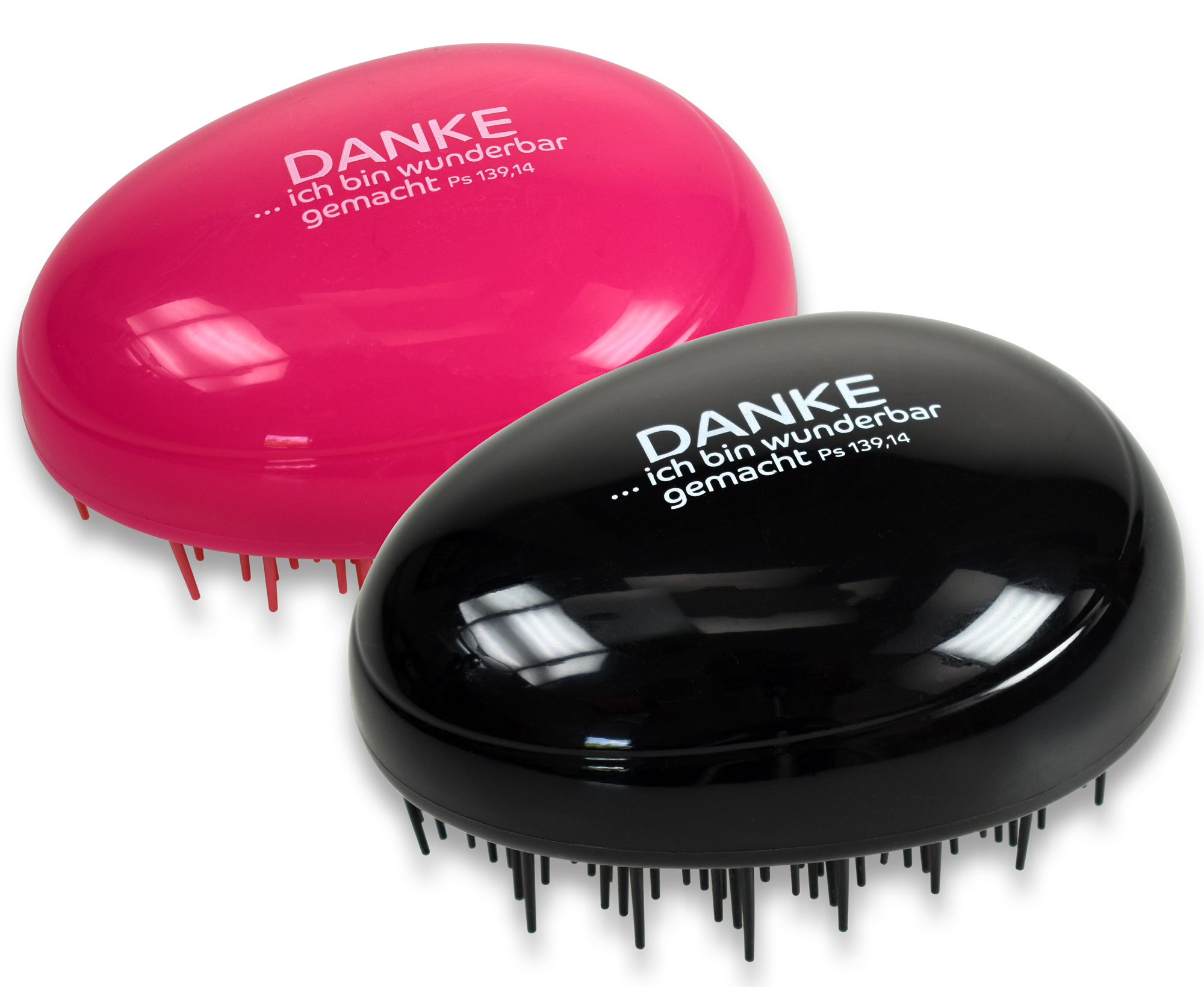 Endlich kein Ziepen mehr: Die handliche Bürste entwirrt schnell und schmerzfrei nasses und trockenes Haar, ca. 9x6,5 cm, bedruckt mit „Danke ... ich bin wunderbar gemacht Ps 139,14“, in Klarsichtverpackung, Preis pro Stück