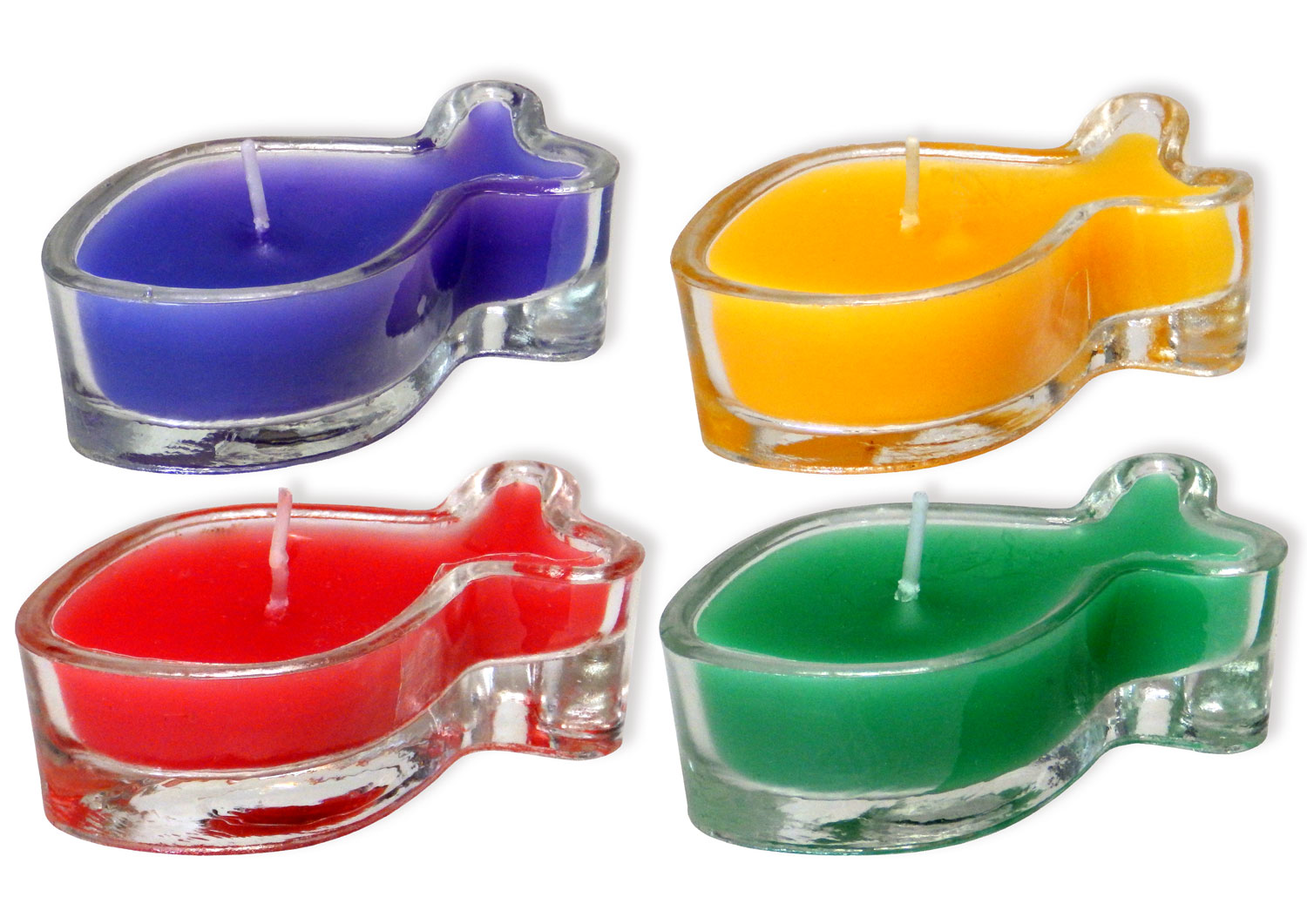 Größe: 6 cm, Wachs, jede Fischkerze einzeln verpackt, versch. Farben, Preis pro Stück