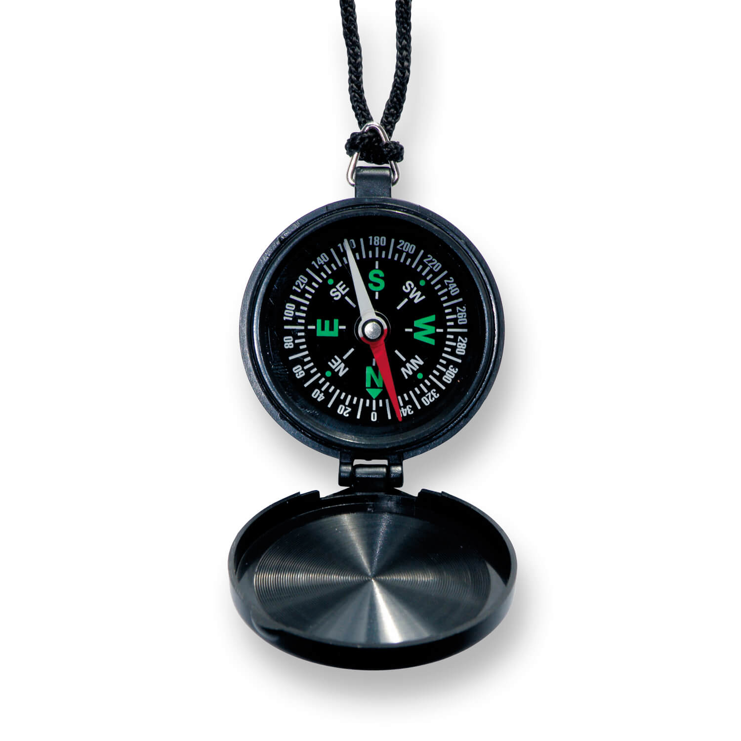 Kompass, schwarz, ø 4,5 cm, Rückseite mit Aufdruck: "Gott ist mitten unter uns", mit Kordel zum Umhängen