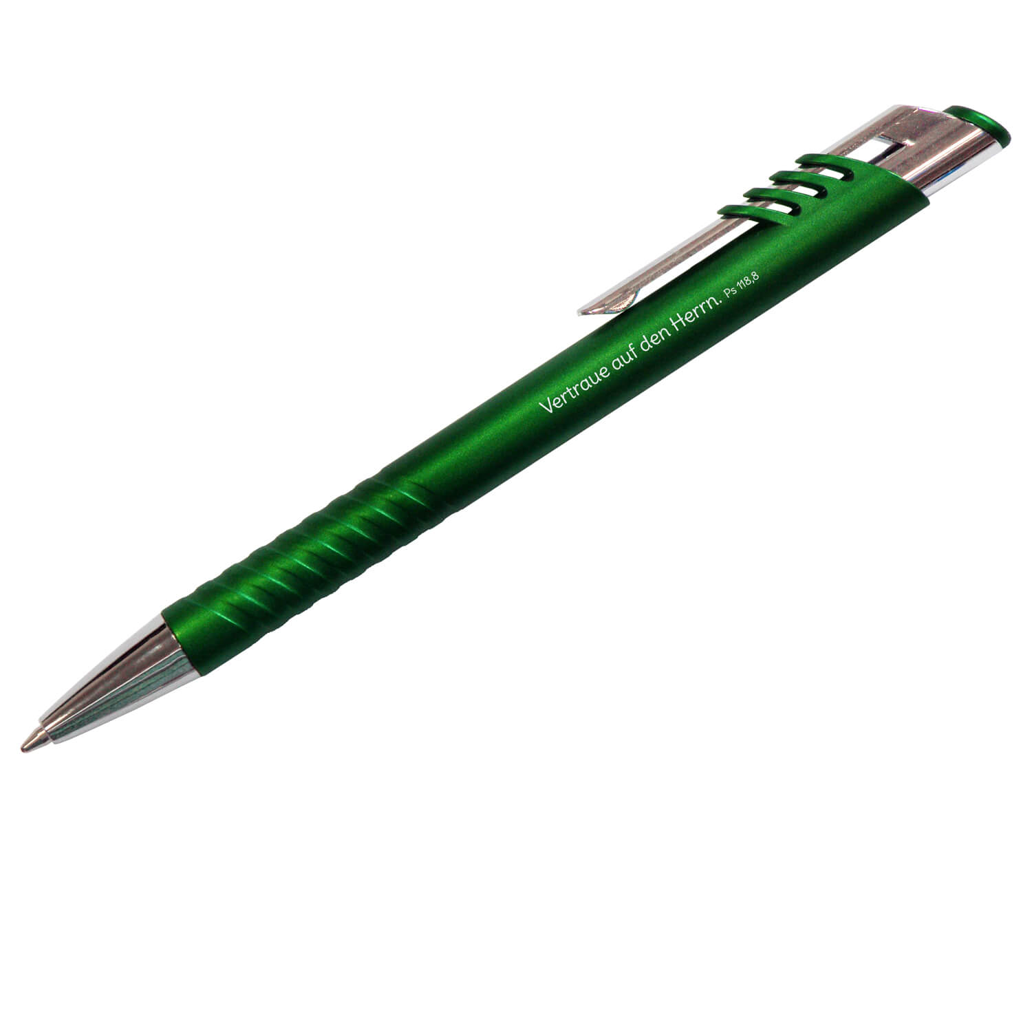 Kugelschreiber aus metallic-grünem Kunststoff, mit Textaufdruck "Vertraue auf den Herrn" - Ps. 118,8