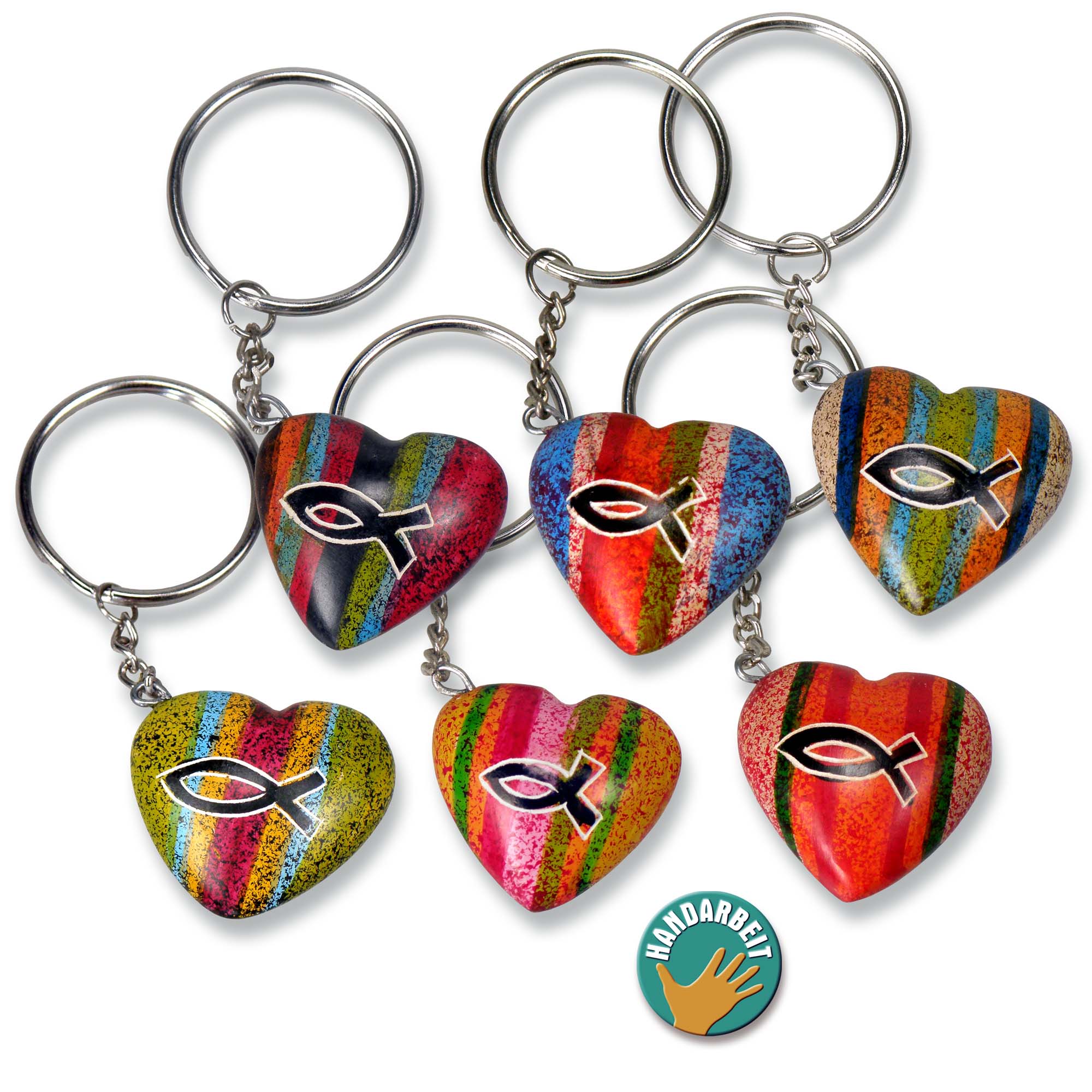 Handgefertigter Schlüsselanhänger aus Speckstein in Herzform mit Ichthys-Symbol. Kein Herz gleicht dem anderen, jedes ist ein Unikat. ca. 4 cm, 6-fach farblich sortiert, Preis pro Stück
