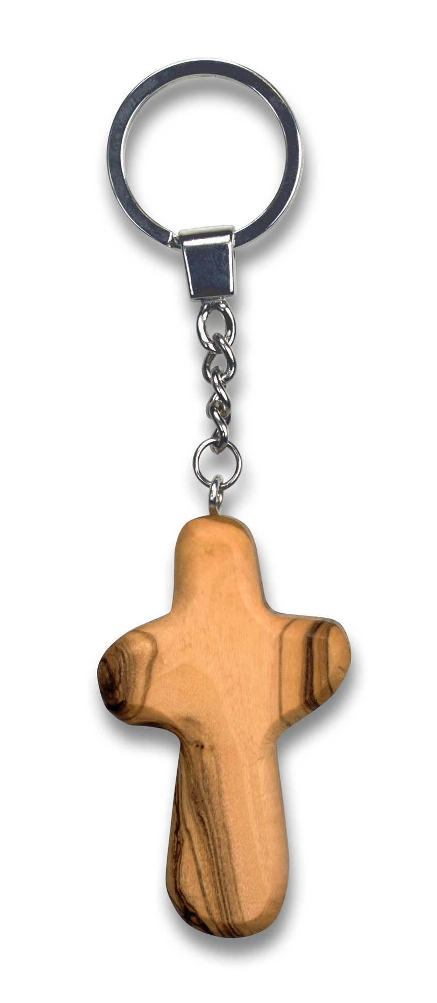 Schlüsselanhänger in Kreuzform aus echtem Olivenholz. An Kette mit Schlüsselring. Format ca. 3x4,5 cm.