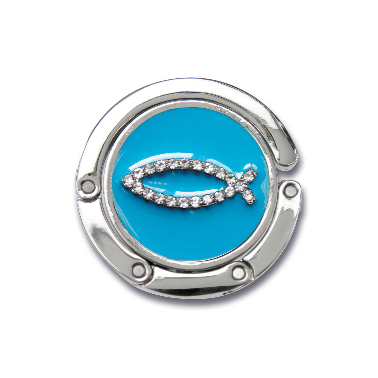 Pfiffiger Taschenhalter aus Metall, Ø 4 cm, mit Fischmotiv aus Strass-Steinen, der äußere Metalrand lässt sich aufklappen und dann als Haken für Taschen, Regenschirme, etc. verwenden.