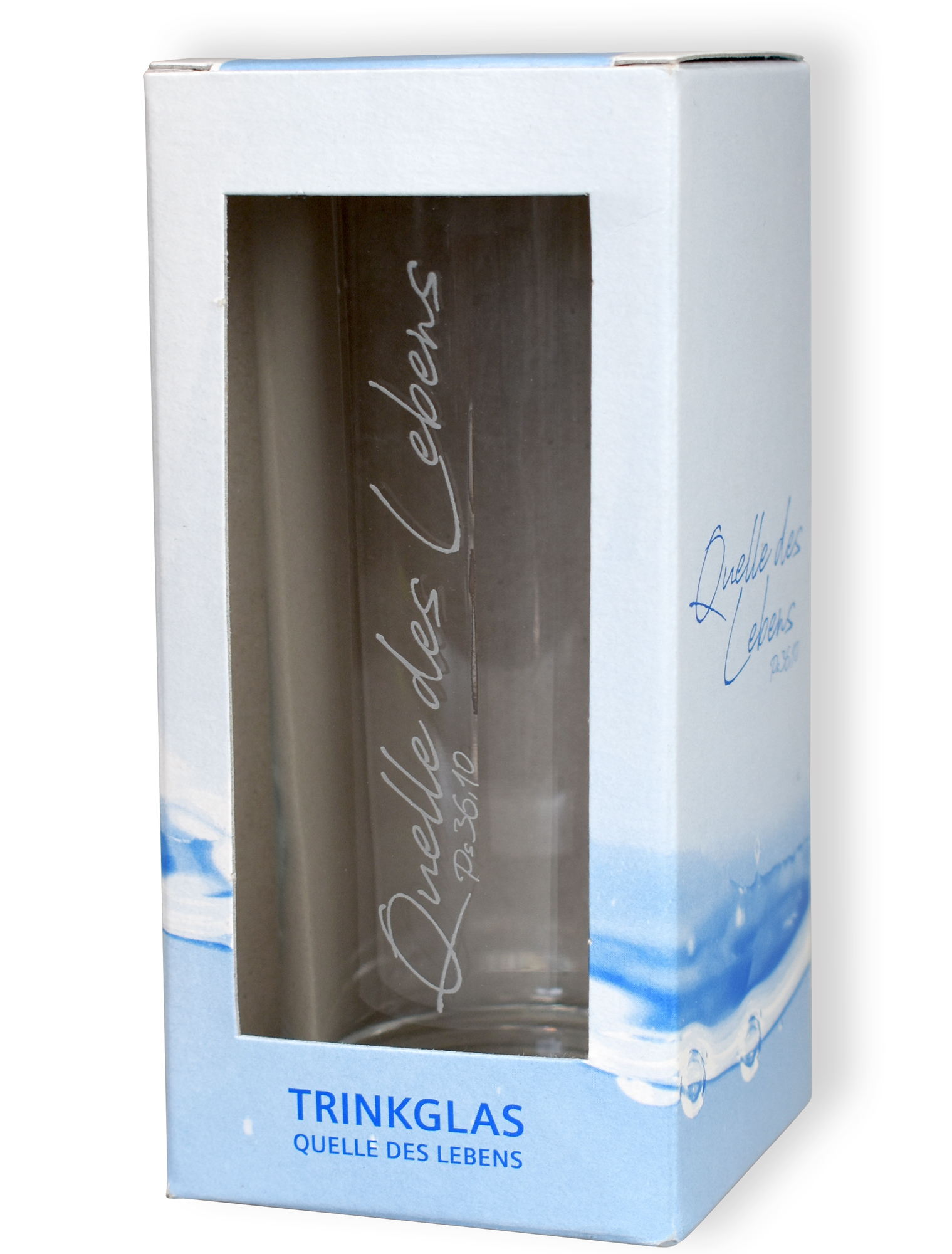 Trinkglas in schlicht-eleganter Optik, 0,25 ltr., Höhe 13,5 cm, mit ätzweißem Druck "Quelle des Lebens Ps 36,10", in Einzelpackung