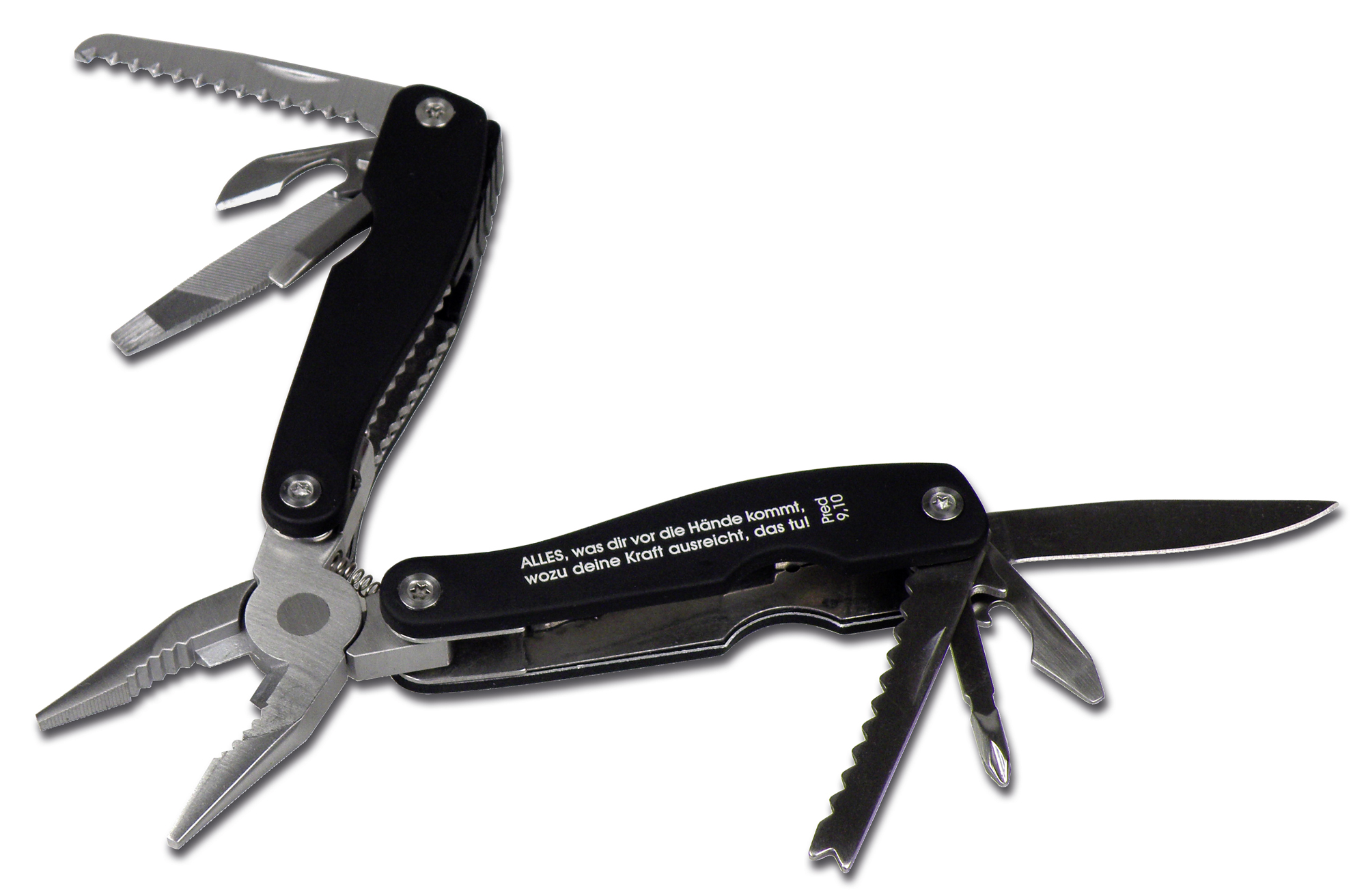 Multifunktionswerkzeug aus Metall mit u.a. Zange, Säge, Flachschlitz- und Kreuzschlitz-Schraubendreher, Feile, Messer, Dosenöffner, Kapselheber, etc. Angenehmer Softtouch-Griff mit eingraviertem Text "ALLES, was dir vor die Hände kommt, wozu deine Kraft ausreicht, das tu!" - Prediger 9,10, inklusive Nylon-Gürteltasche.